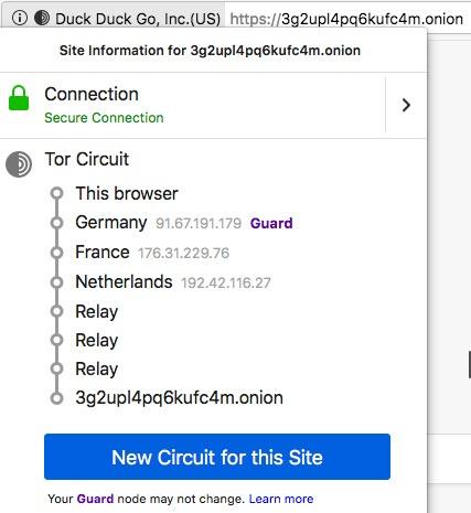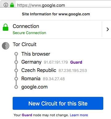We can see that the connection passes first through the Entry Guard (91.67.191.179) in Germary, then through the Middle Relay (87.236.195.253) in the Czech Republic, and finally through the Exit Relay (89.34.27.48) in Romania before it terminates at the Google server.
