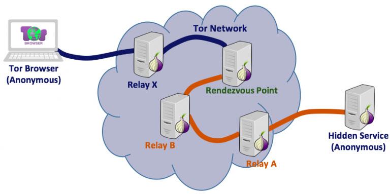 However, when you access a web server that is hidden in the Tor Network, the mechanism of access changes slightly. In short, one Tor Relay server will be chosen as a Rendezvous Point (RP); and then, there will be two chains: one from the Tor client to the RP, and another from the Tor hidden server to the RP. The following diagram shows — from a higher perspective — the Tor provides anonymous access to hidden services: