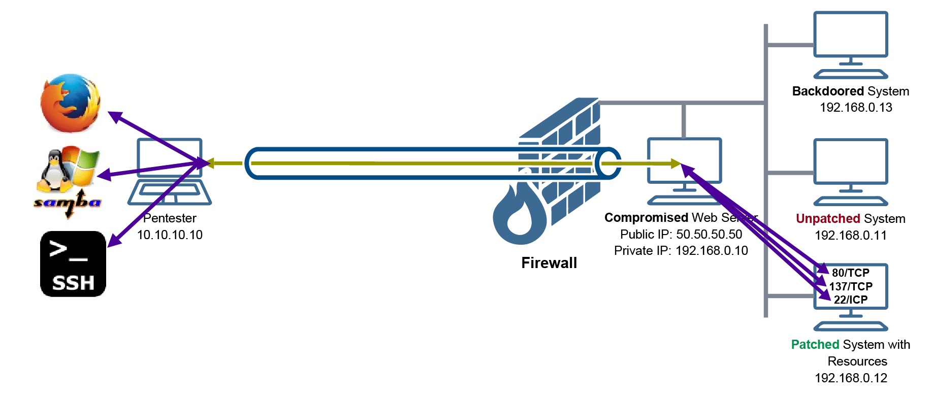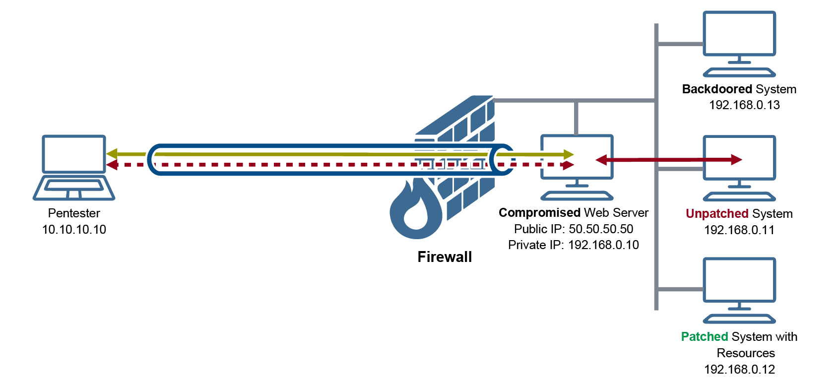- Forward relaying through the first compromised system to browse or access resources on another system: the aim here is to browse any exposed resources (web, files, etc.) on an internal system. Our connection will be relayed through the first victim and tunneled within the same established session. In our scenario, this can be used against 192.168.0.12.